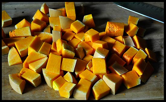 Start by chopping the butternut squash into small cubes. Don't peel it.