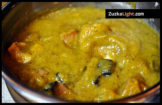 Then add the chicken and all of the chunks of the butternut squash and sweet potatoes into the puree and salt to taste.