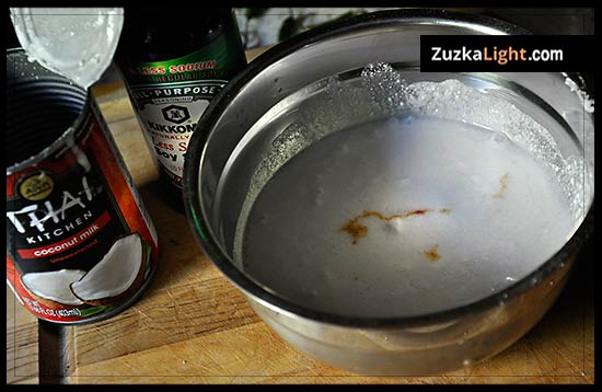 Mix the coconut milk with soy sauce and whisk it together.