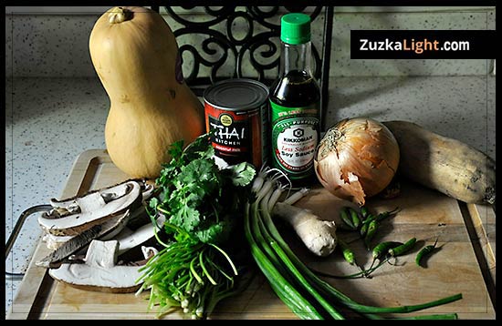 1/2 of Butternut squash, 1 can of unsweetened coconut milk, 1 1/2 tablespoon low sodium soy sauce, 1 large sweet potato, 1 large yellow onion, about 6 stalks of green onions, 3 thai chillies, 1 large portobello mushroom (or 1 cup shiitake mushrooms), bunch of fresh cilantro, salt, 1 cup chicken broth, and chicken breast if you are a meat eater.