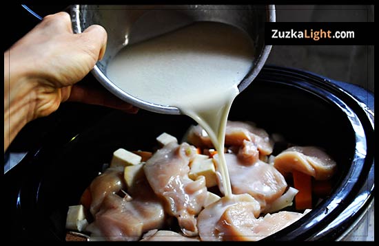 Add the chicken broth into the coconut milk.