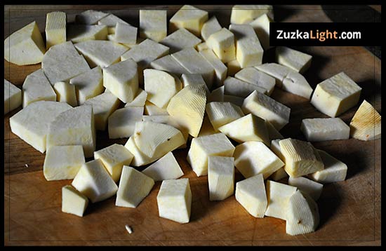 Peel the sweet potato and chop in smaller cubes as well.