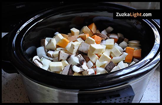 Place all of the chopped and mixed veggies into the slow cooker.